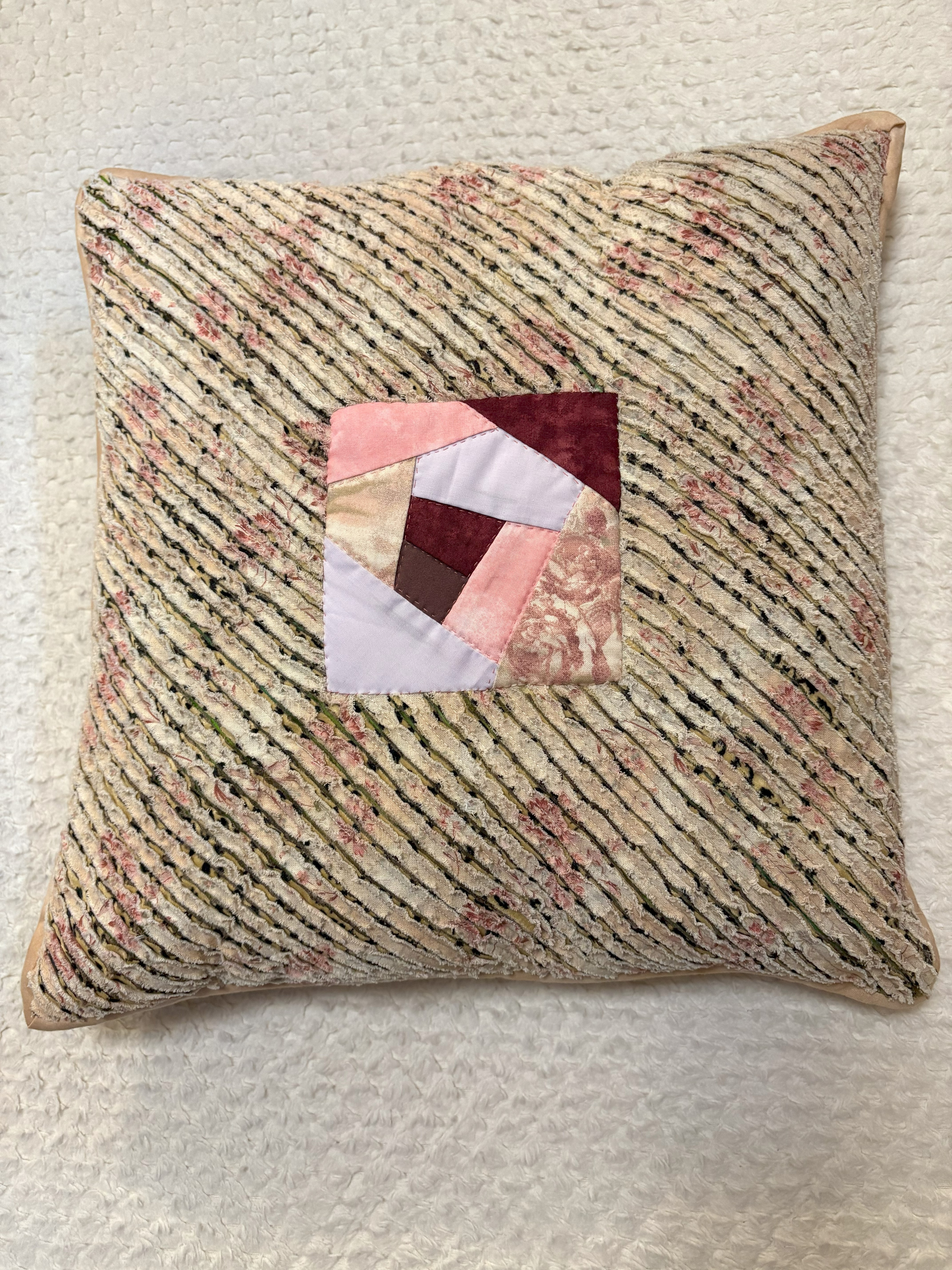 様々なピンク系の布を使ったバラで、フェミニンな「巻きバラのクッション」が仕上がりました(^_^)