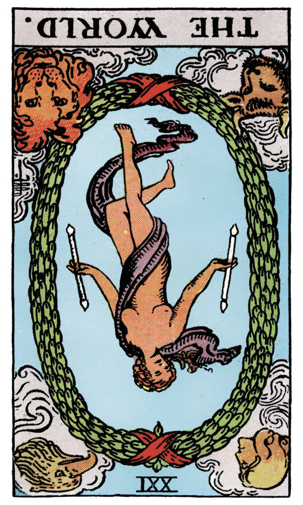2枚目(中央・上)のカードは「世界」(逆位置)。